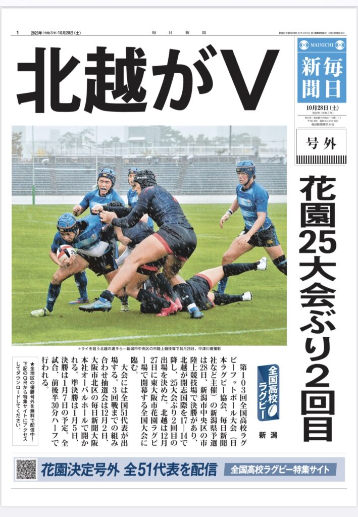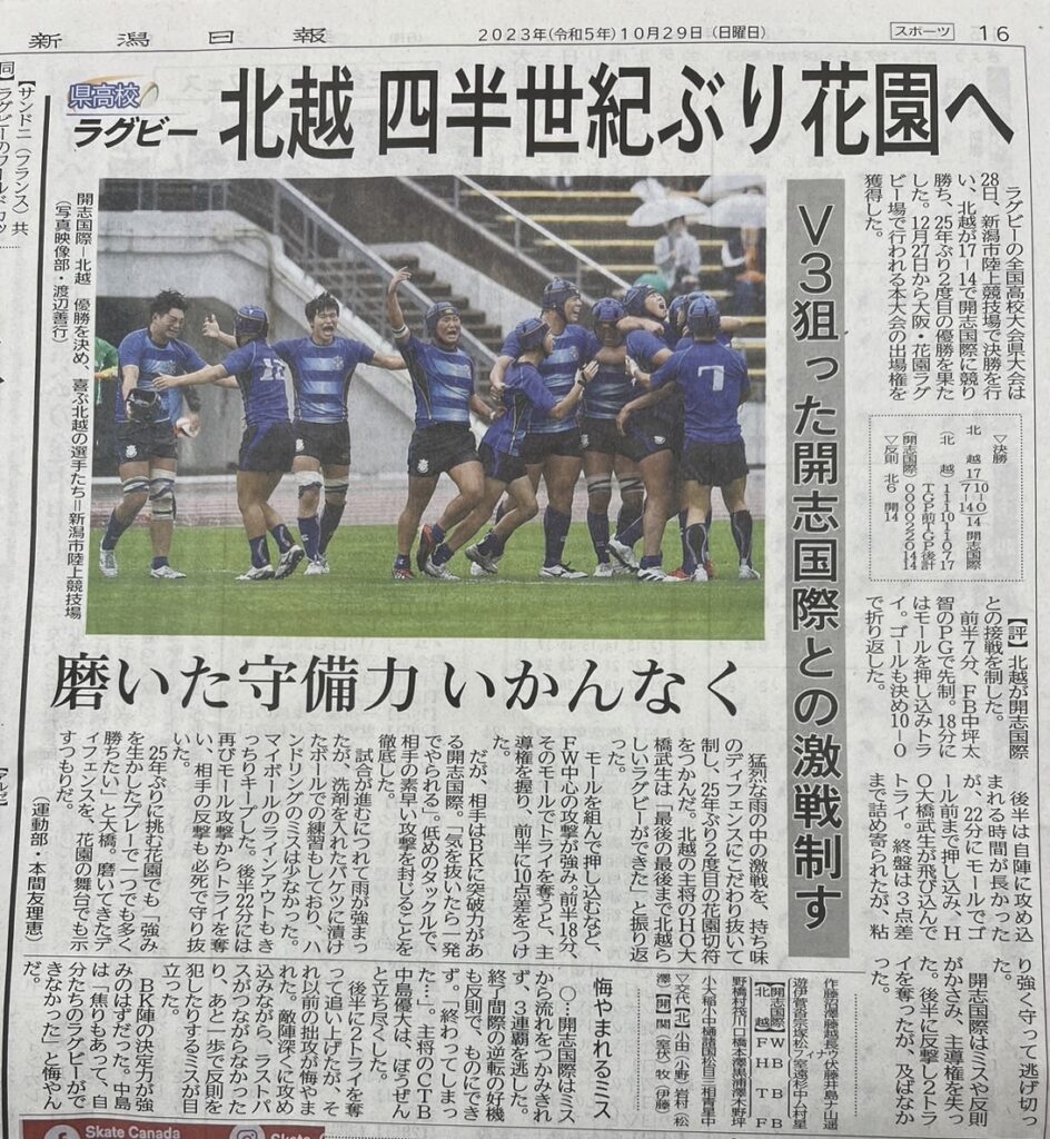 第103回全国高校ラグビー大会新潟県予選決勝が10/28に行われ、北越高校が勝利し優勝しました!